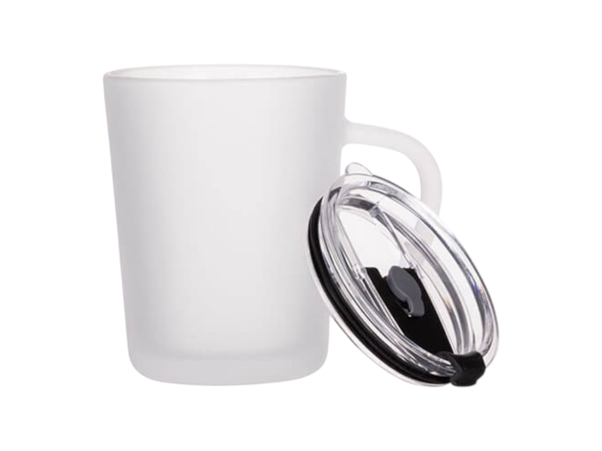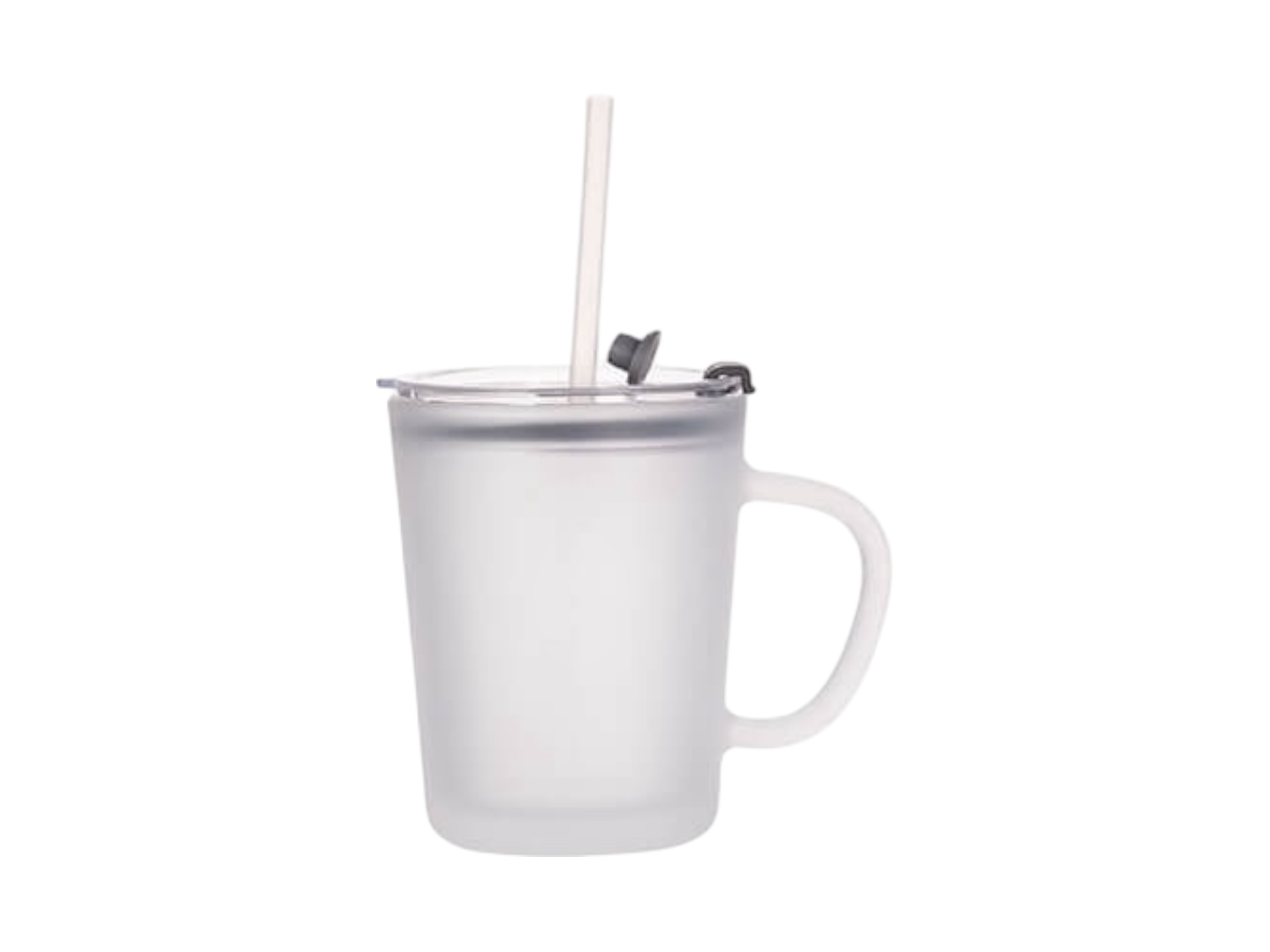 Stylowy kubek wykonany z matowego, szronionego szkła to połączenie nowoczesnego designu i praktyczności. Wyposażony w wygodny uchwyt, przezroczystą pokrywkę oraz słomkę, idealnie sprawdzi się do napojów zimnych i ciepłych. Dzięki możliwości dodania własnej grafiki lub napisu zamienia się w wyjątkowy, jedyny w swoim rodzaju gadżet.