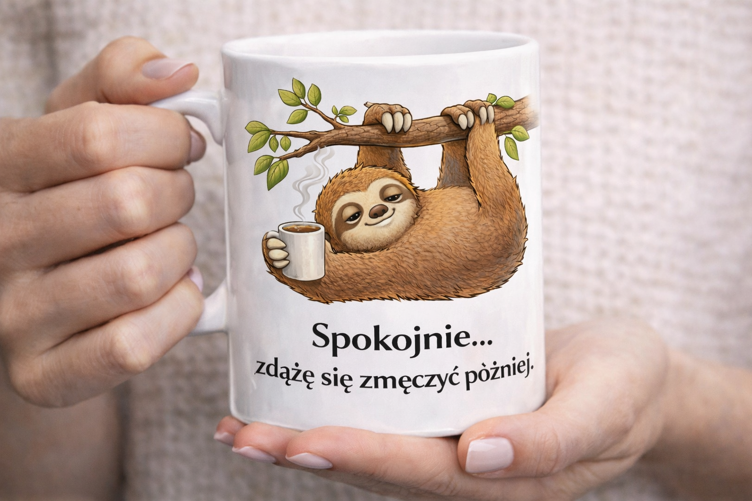 Na grafice znajduje się leniwiec w spokojnej, wyluzowanej pozie z kubkiem kawy i zabawnym napisem. To idealny kubek dla osób, które potrafią podchodzić do życia na luzie i nie przejmują się wszystkim od razu.