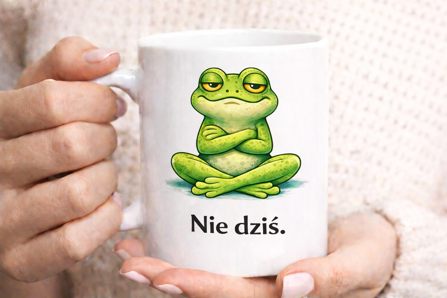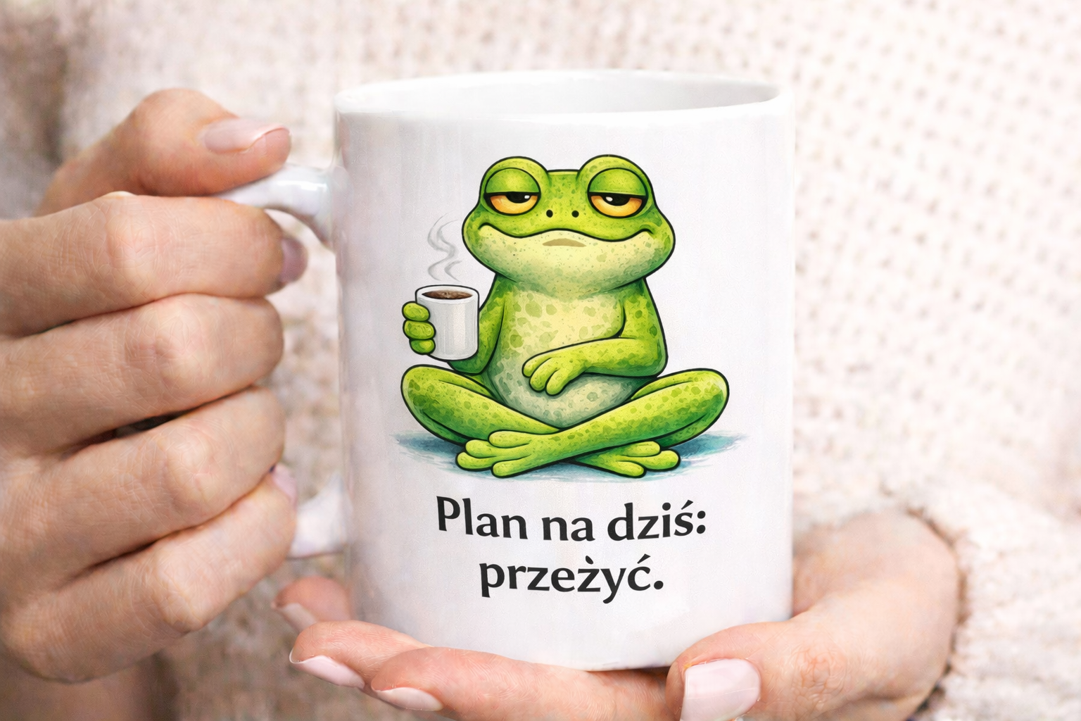 Seria kubków z żabą to zabawne grafiki i teksty, które idealnie oddają codzienne nastroje. Czasem mamy dzień na działanie, a czasem najlepiej pasuje kubek z napisem „Nie dziś” albo „Plan na dziś: przeżyć”.