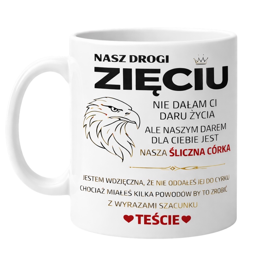 „Nasz drogi zięciu” – kubek od teściów z humorem i klasą