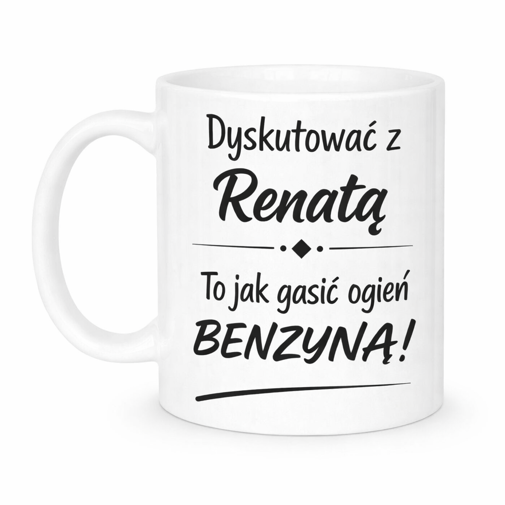 „Dyskutować z Renatą to jak gasić ogień benzyną!” – kubek z humorem (personalizowany)