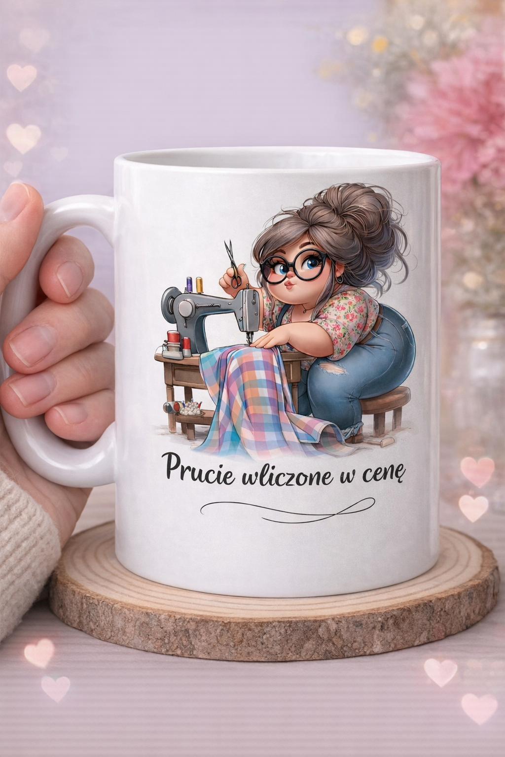 Kubek „Prucie wliczone w cenę” – idealny prezent dla krawcowej