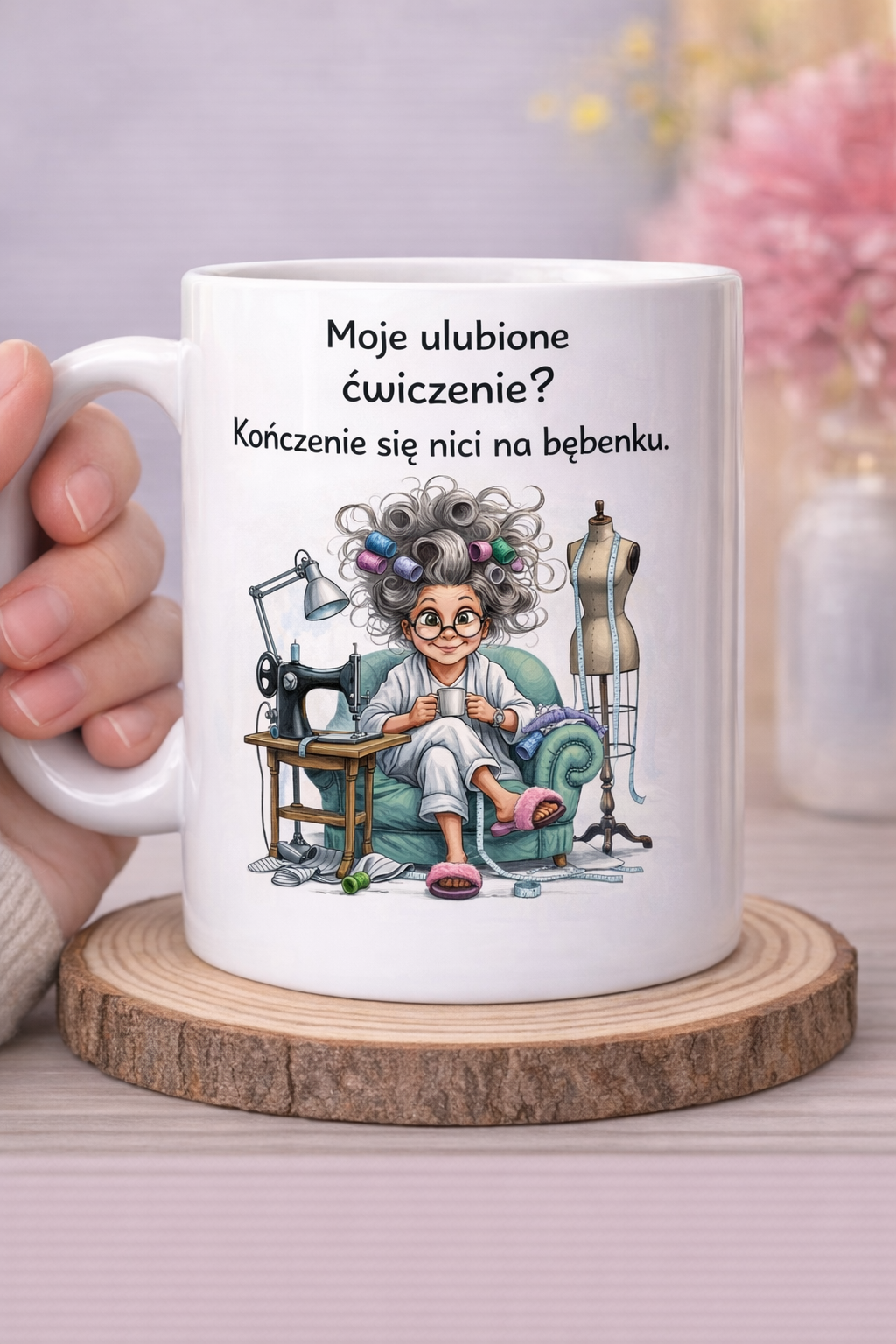 Kubek „Moje ulubione ćwiczenie? Kończenie się nici na bębenku.”
